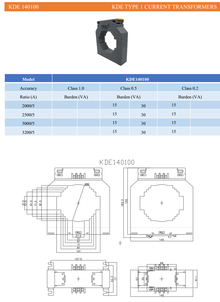 Thông số kỹ thuật "Biến dòng đo lường vuông KDE140100BL-3200/5-0.5-30"