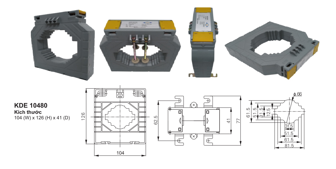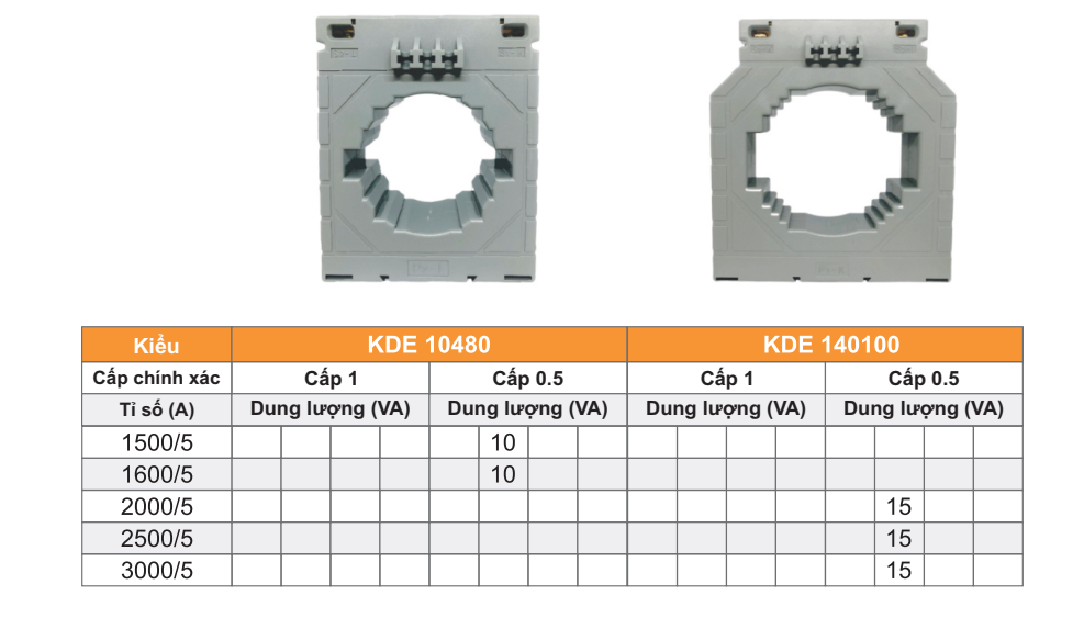 Máy biến dòng KDE kiểu vuông 1, kiểu vuông 2 và kiểu tròn là loại siêu nhỏ nó nhỏ hơn những loại biến dòng nhỏ khác. Phần vỏ bao bọc cực nối thứ cấp được phủ kín bởi các kẹp nhựa. Với các phụ kiện đi kèm người sử dụng có thể dễ dàng lắp đặt trên thanh rail, thanh cái hoặc panel với kiểu , với kiểu 2 thì dễ dàng lắp thanh cái, lắp lên panel với kiểu tròn thì lắp được lên panel.