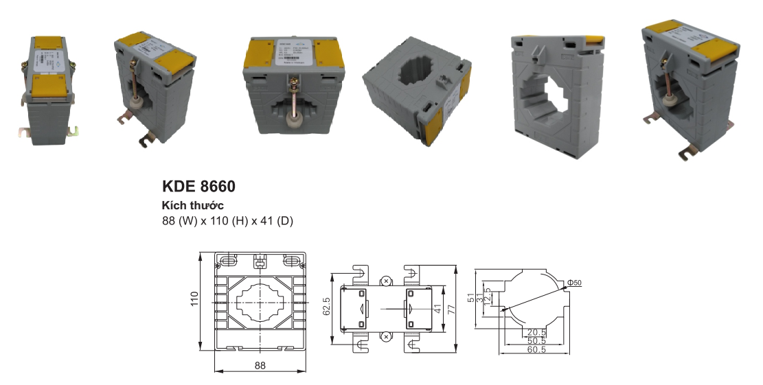 Máy biến dòng KDE kiểu vuông 1, kiểu vuông 2 và kiểu tròn là loại siêu nhỏ nó nhỏ hơn những loại biến dòng nhỏ khác. Phần vỏ bao bọc cực nối thứ cấp được phủ kín bởi các kẹp nhựa. Với các phụ kiện đi kèm người sử dụng có thể dễ dàng lắp đặt trên thanh rail, thanh cái hoặc panel với kiểu , với kiểu 2 thì dễ dàng lắp thanh cái, lắp lên panel với kiểu tròn thì lắp được lên panel.