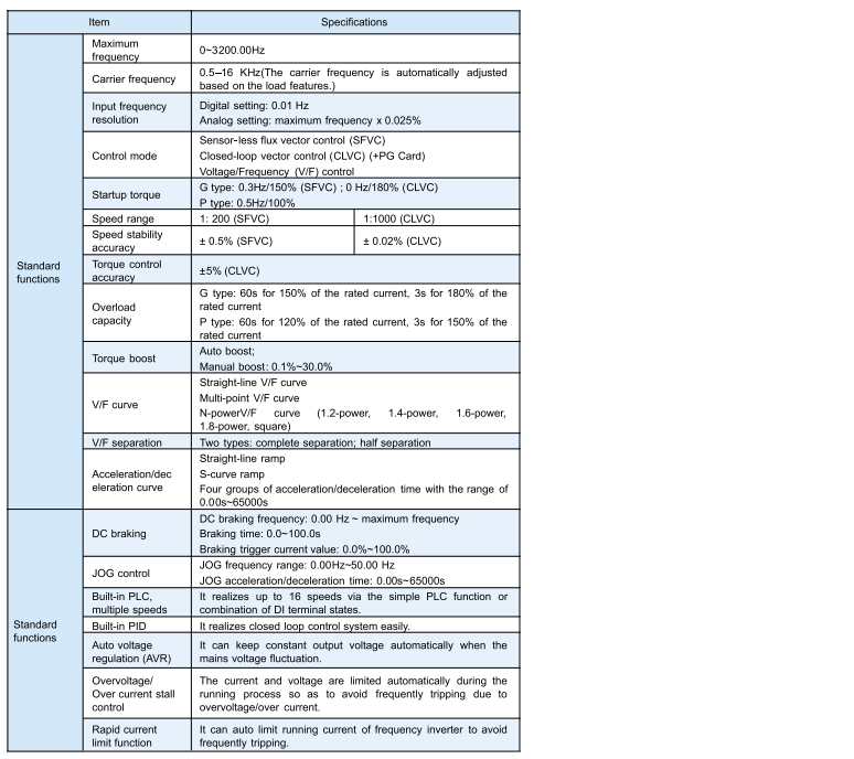 Chức năng bảo vệ: Quá dòng 3 pha đầu ra, bảo vệ quá áp, mất pha, ngắn mạch nối đất, quá tải, quá nhiệt