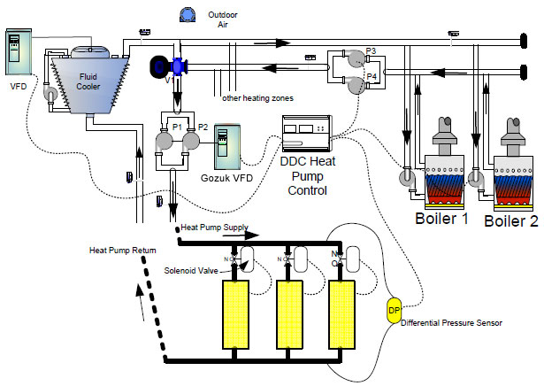 Một mạch vòng bơm nhiệt điển hình, chẳng hạn như trong Hình 2, điều khiển vòng bơm nhiệt tại điểm đặt, bằng van điều biến (V1) để làm nóng và tuần tự bộ làm mát chất lỏng (làm mát). Với các van điện từ được lắp đặt ở mỗi máy bơm nhiệt (HP), dòng chảy giờ đây có thể được điều khiển bằng biến tầnđiều khiển P1 & P2. Động cơ quạt của bộ làm mát chất lỏng cũng có thể được điều khiển bằng bộ biến tần – giúp tăng thêm tính tiết kiệm.